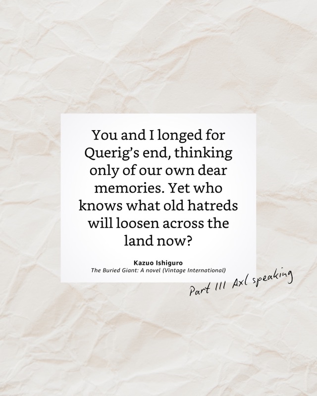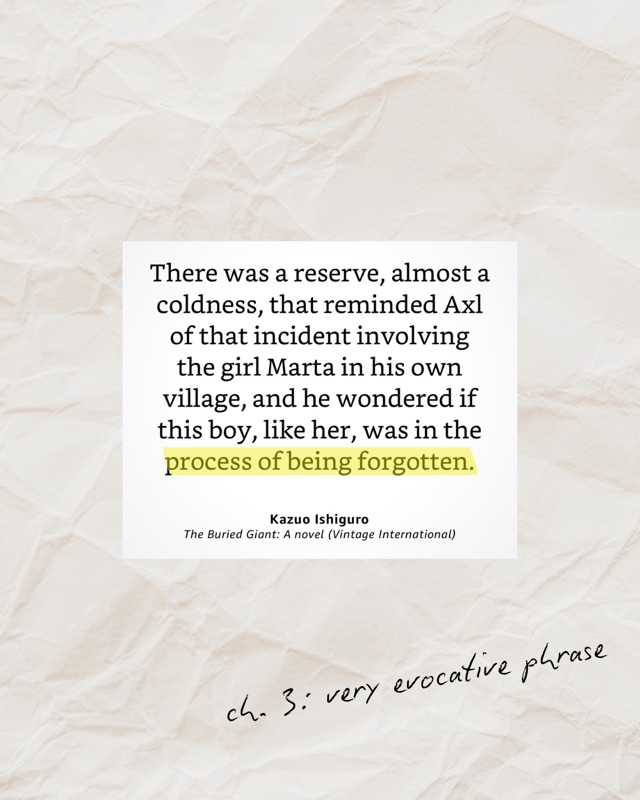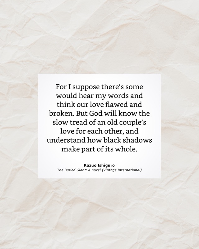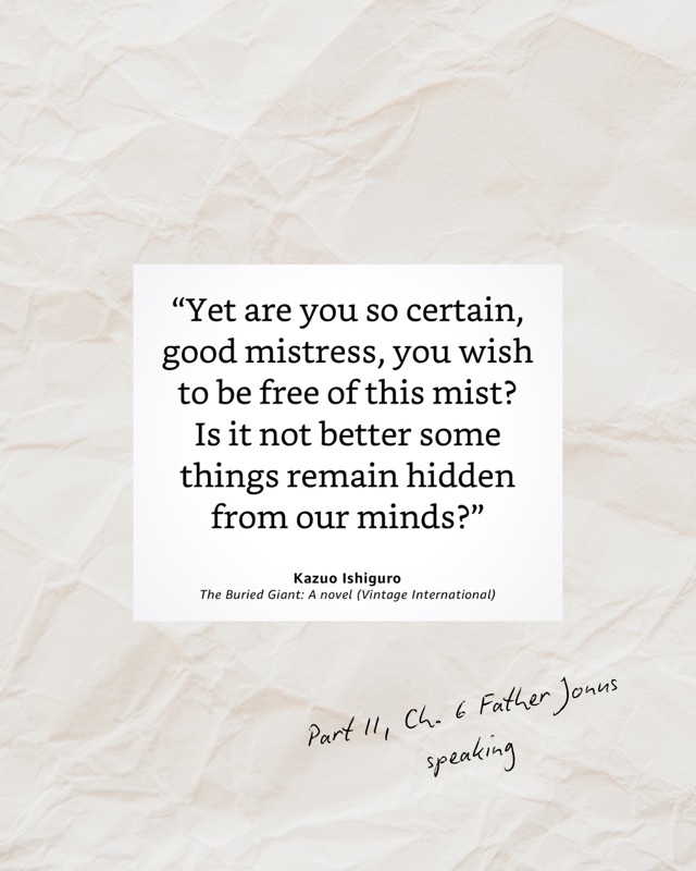 🗡️This book was thought-provoking to say the least. It is a fantastical tale set in post-Arthurian Britain. The language put me in mind of “Lord of the Rings” and I anticipated some morality questing. I was quickly disabused of this notion as it’s much (much!) more than that. BG was not my typical literary fare. I gravitate toward books that let you pull out ethically loaded quotations and reflect on them. TBH I struggled with this one. But I’m glad I finished it because I think the frustration and deep confusion/sense of being lost I often felt with it was intentional on Ishiguro’s part.