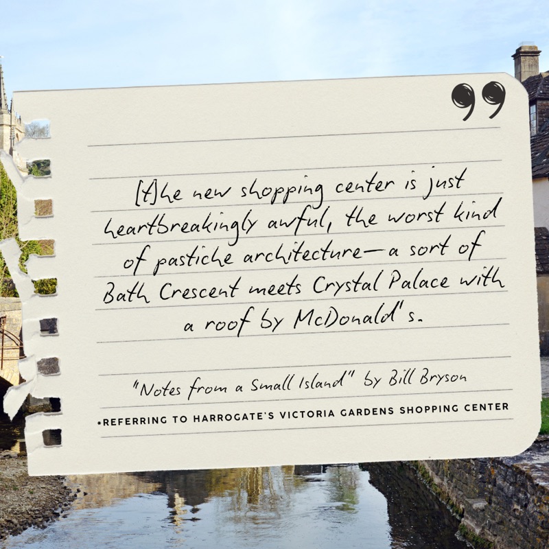 🇬🇧 Humorous zingers notwithstanding, Bryson is a true devotee of British architectural heritage. While he is suffuse in his praise, he is equally unsparing in his criticism. Take for example, his disappointment in the unevenness of the architecture in Oxford or his lamentations on the loss of hedgerows.