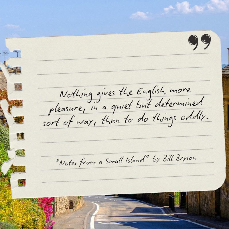🇬🇧 What elevates NFSI from simply a humorous travelogue, is its tone: amused, observant, and deeply human. Bryson reminds us that travel isn’t always about revelation or transformation; sometimes it’s about noticing what’s right in front of you, preferably while slightly lost and mildly annoyed. In doing so, he captures not just a place, but the feeling of moving through it.